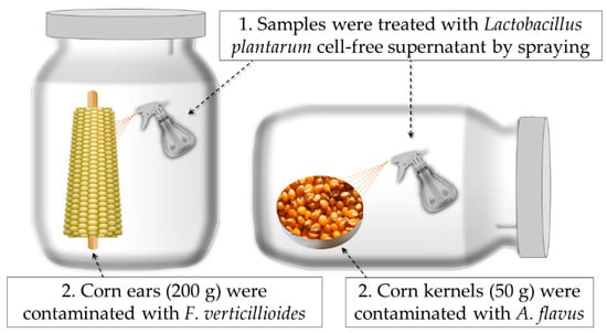 To evaluate the antifungal and antimycotoxigenic activity of the CFS by L. plantarum CECT 749, the study was carried out using corn kernels contaminated with A. flavus ISPA 8111 (AFB1 producer) and corn ears contaminated with F. verticillioides CECT 2982 (FB1 producer). These strains were selected according to the fungal sensitivity to fermented CFS—demonstrated by qualitative and quantitative assays (Section 4.4 and Section 4.5); the main steps of food production chain in which the fungal contamination occurs; and the mycotoxin production—previously determined in corn and corn ears.