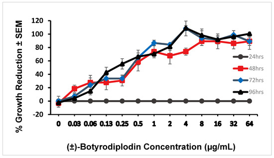 (±)-Botryodiplodin (0 to 64 μg/mL) dissolved in the culture medium of parallel axenic cultures of the aquatic plant of Lemna pausicostata (duckweed) induced a phytotoxic response in intact, growing plantlets floating on the surface of the culture medium over a 96-hour period (Figure 1) that was indistinguishable from the phytotoxic response to (−)-botryodiplodin prepared as described by Ramezani et al. (2007) [32]. Phytotoxicity was measured as percent growth reduction measured by the number of plantlet fronds produced relative to parallel control cultures not treated with (±)-botryodiplodin. Additional phytotoxicity occurred as a formation of necrotic tissue with light brownish color around the edges of the fronds and some bleaching progressing to 100% growth inhibition, 100% mortality, and complete bleaching. No detectable toxicity was observed at 24 hours, because growth was measured as frond number and more time than that was needed for a plantlet to generate a new frond under conditions used. However, the full extent of toxicity was observed at 48 hours with IC50 = 0.22 μg/mL. The dose-response curves at 72 hours (IC50 = 0.19 μg/mL) and 96 hours (IC50 = 0.18 μg/mL) were not significantly different from each other (Pearson’s r = 0.993, p = 0.601, multiple linear regression analysis), or from that at 48 hours (Pearson’s r = 0.994, p = 0.995 at 72 hr; r = 0.984, p = 0.874 at 96 hrs, multiple linear regression analysis).