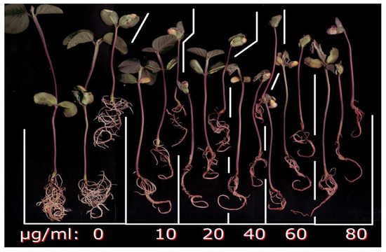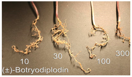 Pink to red discoloration of exposed roots occurred at the highest (±)-botryodiplodin concentration (300 μg/mL) in sand culture (Figure 5), and at the higher concentrations tested in liquid hydroponic culture (Figure 4), with the darkest coloration at the highest concentration (80 μg/mL). Formation of pigment by reaction of botryodiplodin with protein and other amines has been observed numerous times [26,35,39,46,47]. The (±)-botryodiplodin used in the present study has been shown to react with proteins, amino acids, and a wide variety of other amines to give red to yellow pigments [48]. Given that soybean seedlings have been reported to express proteins such as nutrient and water transporters on root surfaces [49], the pink to red pigment observed on soybean seedling roots treated with (±)-botryodiplodin in hydroponic culture (Figure 4 and Figure 5) may have formed by a similar reaction with root surface proteins.