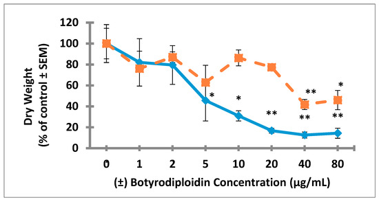 Inhibitory effects of various (±)-botryodiplodin concentrations in hydroponic culture medium (0 to 80 µg/mL) on lateral soybean seedling root growth (---◊---) with inhibition at IC50 = 4.2 µg/mL (100% dry weight = 11.5 ± 2.1 mg), and on tap root growth (- - - ■ - - -) with inhibition at IC50 = 23.5 µg/mL (100% dry weight = 13.8 ± 2.0 mg). Root growth presented on the vertical axis was measured as dry weight of excised lateral or tap roots after (±)-botryodiplodin exposure for 96 h at room temperature in continuous light. Results are the mean of three replicates ± SEM. * Significantly reduced soybean root growth at p < 0.05; ** significantly reduced soybean root growth at p < 0.01 (Student’s t-test).