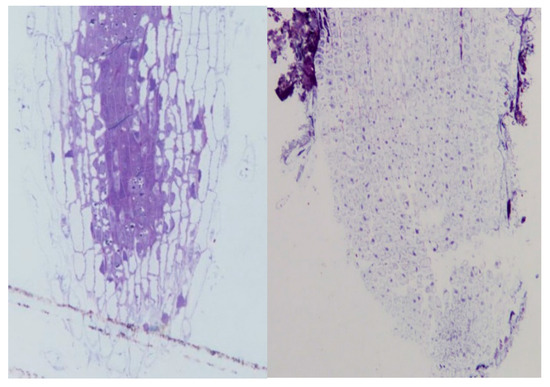 Light micrographs of root tips of soybean seedlings after four days in hydroponic culture in 10% Villagarcia medium in water with no (±)-botryodiplodin (left panel, 400×) or with (±)-botryodiplodin (15 µg/mL) (right panel, 200×).