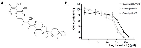 Lasalocid structure and cytotoxicity. (A) Chemical structure of lasalocid. (B) HeLa cells, L929 cells or human umbilical vein endothelial cells (HUVECs) were incubated with lasalocid at the indicated concentrations, DMSO 10% or left untreated (controls) overnight, before incubation with resazurin. Fluorescent signal, reflecting viability, was measured and data were normalised (100% viability corresponding to untreated cells and 0% to treated cells with 10% DMSO).