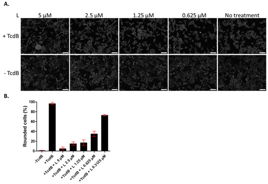 Lasalocid inhibits toxin B (TcdB) induced-HUVEC rounding. HUVECs were treated overnight with lasalocid (L) in the presence or not of TcdB, or left without TcdB or lasalocid (control conditions). The following day, cells were fixed and imaged with a Cytation 5 reader (objective 10×) (A). Rounded cells were then counted and normalized to the number of total cells (B). Scale bar: 200 µm.