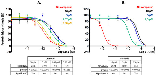 Then, we investigated whether lasalocid could protect cells from ETA and Stx1 that traffic through the retrograde pathway, translocate into the cytoplasm from the ER and inhibit protein synthesis. We chose HeLa cells for Stx1 experiments and L929 cells for the ones involving ETA because these cells are more sensitive to ETA [17] and allowed us to reduce the quantity of toxin to use. Lasalocid strongly protected cells from Stx1 and ETA (Figure 3A,B), reducing toxicity more than 20-fold and 2500-fold, respectively. Hence, lasalocid has broad-spectrum antitoxin properties, acting on unrelated toxins trafficking either through the endo-lysosomal pathway or the Golgi-ER retrograde pathway.