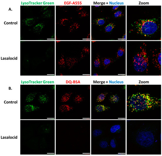 Following receptor-mediated endocytosis CNF1, DT and TcdB exploit the endolysosomal pathway to reach the cytoplasm [18,19,20,21]. Thus, we investigated the effect of lasalocid on this trafficking pathway. HeLa cells were treated with lasalocid for 6 h. During the last 30 min, different fluorescent probes were added to the cells. This comprises LysoTracker Green, which accumulates in lysosomes due to their low pH, and Alexa555-labelled epidermal growth factor (EGF-A555), which enters cells through clathrin-dependent endocytosis (Figure 4A). The EGF/EGF receptor (EGFR) complex traffics through the endo-lysosomal pathway, and EGFR can be either recycled back to the plasma membrane or reach lysosomes together with EGF where acidic-based protein degradation occurs. After lasalocid treatment, no LysoTracker signal could be detected. In contrast, the EGF-A555 signal remained identical in treated and untreated control cells. These results suggest that lasalocid-treated cells can still internalize proteins (here shown with EGF) but have an alteration of lysosomes or/and lysosomal acidification as reflected by the loss of LysoTracker staining. Furthermore, we exposed cells to lasalocid for 6 h and added DQ Red bovine serum albumin (DQ-BSA). DQ-BSA is labelled with a fluorophore that is quenched when the protein is intact and emits fluorescence after degradation at low pH (i.e., in lysosomes) (Figure 4B). No DQ-BSA signal could be recorded in lasalocid-treated cells, indicating a defect of low pH-dependent degradation of BSA.
