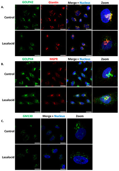 ETA and Stx1 travel from early endosomes to the Golgi apparatus, and then reach the endoplasmic reticulum in order to get access to the cytoplasm. Based on the capacity of lasalocid to protect cells against these toxins, we investigated the impact of this compound on the distribution of several Golgi makers, namely GOLPH2, GOLPH4, GM130, giantin and the trans-Golgi Mannose-6-Phosphate Receptor (M6PR). In control cells, the markers of Golgi sub-compartments form condensed and perinuclear structures, as expected (Figure 5). However, GOLPH2 and GOLPH4 displayed a scattered cytoplasmic localization upon lasalocid treatment. Interestingly, giantin, GM130 and M6PR localization patterns remain unaffected. Therefore, lasalocid partially affects Golgi protein localization.