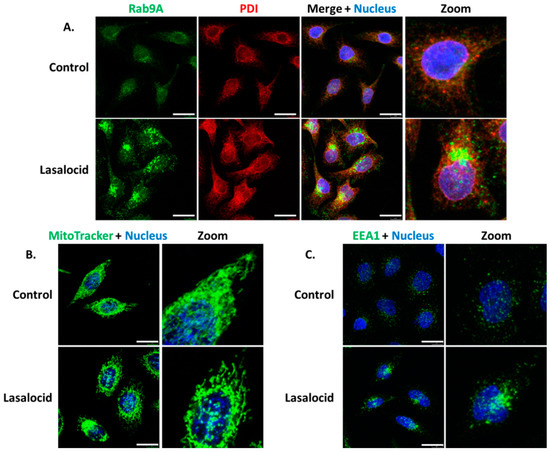 Since lasalocid affects the pH of endolysosomal vesicular compartments and the phenotype of the Golgi apparatus, we investigated its effect on other organelles by monitoring proteins implicated in cellular trafficking. Endoplasmic reticulum (PDI labelling) and mitochondria (MitoTracker labelling) are also affected by lasalocid (Figure 6A,B). Lasalocid modifies recycling vesicles and early endosomes as indicated by immunostaining of their respective markers, Rab9A and EEA1 (Figure 6A,C). Both types of compartments appear more condensed with changes in their distribution patterns.