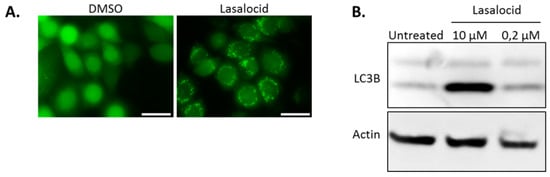 Autophagy is a cellular process leading to vesicle fusion with lysosomal compartments and degradation of vesicular content. Because lasalocid affects vesicles’ pH and trafficking, we investigated its impact on autophagy. HeLa cells expressing the fluorescent autophagy marker GFP-LC3B were treated 6 h with lasalocid (or DMSO as a control), and imaged by fluorescence microscopy (Figure 7A). In control cells, GFP-LC3B fluorescence appeared diffused throughout cells with a stronger labelling in the nuclei than in the cytoplasm. In contrast, in the lasalocid-treated cells, GFP-LC3B gave a pattern of intense perinuclear dots. In addition, SDS-PAGE and Western blots were performed on HeLa cells with antibodies targeting the LC3B isoform of LC3 and actin as a loading control (Figure 7B). The results show that lasalocid induces the accumulation of the faster migrating form of LC3B called LC3B-II. LC3B-II, a lipidated form of LC3B, is a marker of autophagophores. This effect is dose dependent. In conclusion, lasalocid affects autophagy, either by increasing autophagic vesicles formation or by lowering their degradation.