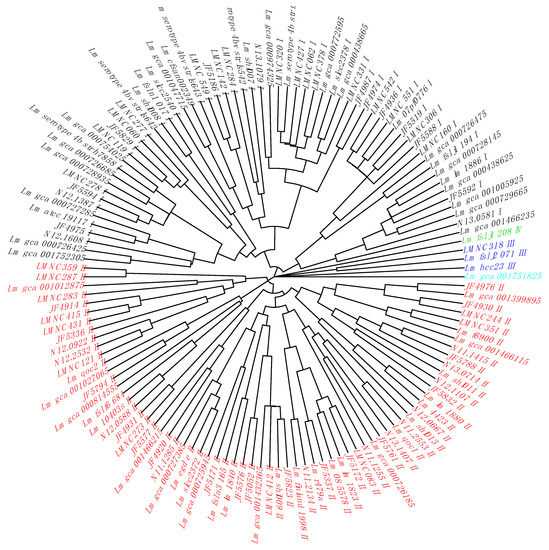In a second step, we added our own collection of L. monocytogenes strains [26] (n = 227) with their cgMLST alleles (Table S4) and metadata annotation (Table S5). We extracted their non-redundant gene alleles corresponding to the previously identified 14 cgTASs (Table S6). By clustering the non-redundant cgTAS alleles patterns with nominal hierarchical clustering, we obtained the dendrogram (Figure 1) showing that the 14 cgTASs are sufficient to separate the L. monocytogenes lineages (I, II, III, and IV). These results are in agreement with previous MLST analysis using seven housekeeping genes [14]. This clustering allows for characterizing the lineage membership of strains that did not have metadata information available (e.g., Lm_gca_000729665 as Lineage I and Lm_gca_001466115 as Lineage II). However, one cannot infer any causal role for the cgTASs in the lineage separation, as clustering the alleles of some subsets of core genes among the 1748 core genes would potentially show the same lineage split.