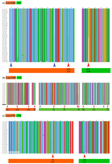 - Ward, T.J.; Ducey, T.F.; Usgaard, T.; Dunn, K.A.; Bielawski, J.P. Multilocus genotyping assays for single nucleotide polymorphism-based subtyping of Listeria monocytogenes isolates. Appl. Environ. Microbiol. 2008, 74, 7629–7642. [Google Scholar] [CrossRef] [PubMed]