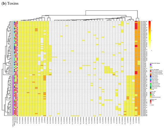 By subtracting the cgTAS hits from the L. monocytogenes strains in TASmania, all other TASs are classified as accessory TASs (acTASs) (Table S7, Figure A1). In order to obtain a better understanding of the role of accessory TASs, we performed a gene analysis with a set of 227 L. monocytogenes strains [26] for which we have the corresponding metadata (Table S5). These isolates are not part of the TASmania database, so we processed them by first predicting protein genes with Prodigal [30] and annotating them with the TASmania HMMs [23]. Finally, we built a heatmap of those acTASs (Table S8) for antitoxins (Figure 3a) and toxins (Figure 3b) after removing the core genes and the redundancy as described above.