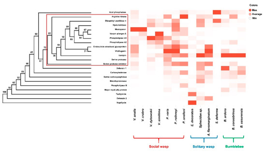 According to the hierarchical clustering analysis for the 22 representative venom genes, most of the allergens and pain-producing factors (arginine kinase, dipeptidyl peptidase 4, endocuticle structural glycoprotein, hyaluronidase, mastoparan, phospholipase A1, phospholipase A2, serine protease, serine protease inhibitor, venom allergen 5, and vitellogenin) were clustered in a clade although its bootstrap value (52%) did not strongly support the topology (Figure 1; see red rectangle). These venom genes showed significantly high expression levels in the social wasps examined. This suggests that social wasps might have evolved to use these components as defensive tools against intruding species (Figure 1).