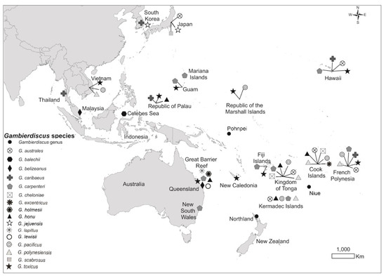 Map of Pacific region showing the geographic distribution of Gambierdiscus species. (Modification of Figure 3, Rhodes et al. 2017 [28], 2017 Harmful Algae News).