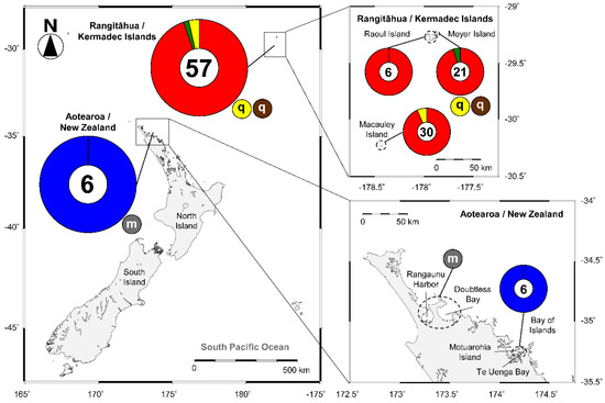 Summary of the geographic distribution of the genera Gambierdiscus and Fukuyoa in coastal areas of Rangitāhua/Kermadec Islands and Aotearoa/New Zealand. The numbers in each pie chart indicate the number of strains identified by DNA sequencing. The letters in each circle indicate other detection methods (q: quantitative PCR; m: light microscopy). Colours represent Gambierdiscus and Fukuyoa species (red: G. australes; green: G. honu; yellow: G. polynesiensis; brown: G. pacificus; blue F. paulensis; grey: G. cf. toxicus).