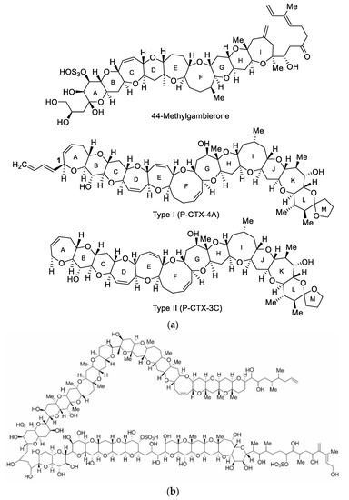 (a) Chemical structures of 44-methylgambierone, previously reported as maitotoxin-3 (copied from Murray et al., 2019 [73]). There are two distinct structural types in the P-CTX class: Type I (P-CTX-4A) and Type II (P-CTX-3C). Both contain a 13-ring (A–M) backbone, with the main differences being the aliphatic hydrocarbon chain on C1 (A-ring) for Type I, and the size of the E-ring (seven-membered for Type I and eight-membered for Type II). (b) Chemical structure of maitotoxin-1 (MTX-1: adapted from Murata et al. 1993 [71].