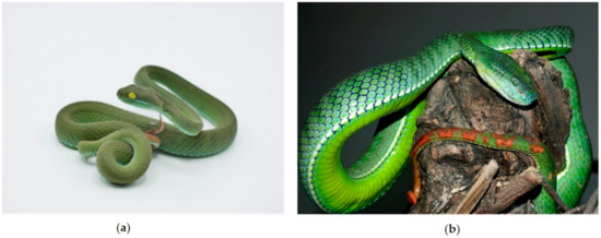 - Malhotra, A.; Thorpe, R.S. A phylogeny of the Trimeresurus group of pit vipers: New evidence from a mitochondrial gene tree. Mol. Phylogenet. Evol. 2000, 16, 199–211. [Google Scholar] [CrossRef]