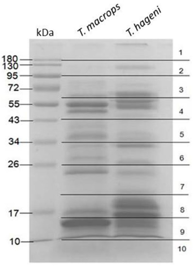 Coomassie blue-stained 12% sodium dodecyl sulfate polyacrylamide gel electrophoresis of T. macrops and T. hageni venoms (30 µg) under reducing conditions.