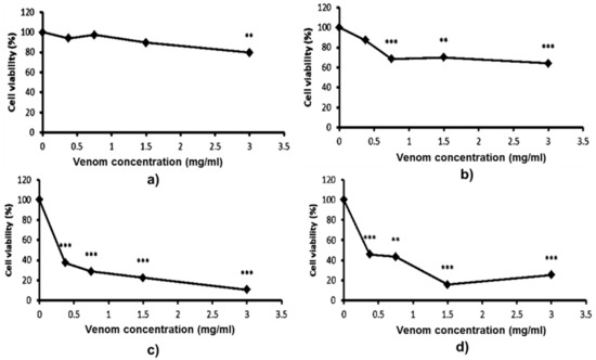 Cytotoxicity of Trimeresurus macrops and T. hageni venoms on human monocytic cells determined by 3-(4,5-dimethyl thiazol-2-yl)-2,5-diphenyl tetrazolium bromide (MTT) assay. U937 cells were treated with 0 to 3 mg/mL T. macrops venom for 48 (a) and 72 h (b) or with 0 to 3 mg/mL of T. hageni venom for 48 (c) and 72 h (d). Percentage U937 cell viability of venom-treated compared with non-venom treated cells (control). Data represent the mean ± standard error of mean (SEM) from three independent experiments, ** p < 0.01, *** p < 0.001.