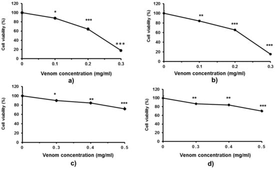 Cytotoxicity of Trimeresurus macrops and T. hageni venoms on human skin fibroblasts determined by 3-(4,5-dimethyl thiazol-2-yl)-2,5-diphenyl tetrazolium bromide assay. CRL-1474 skin fibroblasts were treated with 0 to 0.3 mg/mL T. macrops venom for 48 (a) and 72 h (b) or with 0 to 0.5 mg/mL T. hageni venom for 48 (c) and 72 h (d). Percentage CRL-1474 fibroblast cell viability of venom-treated compared with non-venom treated cells (control). Data represent the mean ± standard error of mean (SEM) from two independent experiments, * p < 0.05, ** p < 0.01 and *** p < 0.001.