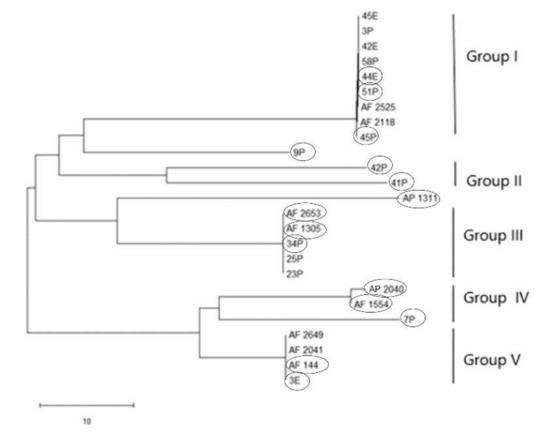 UPGMA cluster analysis generated from RAPD-PCR of 40 Aspergillus isolates. E isolates are from Egypt, P isolates are from Philippines, A. flavus AF 2525 is from China, AF 2118 is from Indonesia, AF 1305 is from India, AP 2040, AF 2041 and AF 2042 are from Australia, AP 143 is from Uganda and isolates AP 1311, AF 2653, AF 1554, AF 2649 and AF 144 are from USA. Aflatoxigenic isolates are surrounded by circles.