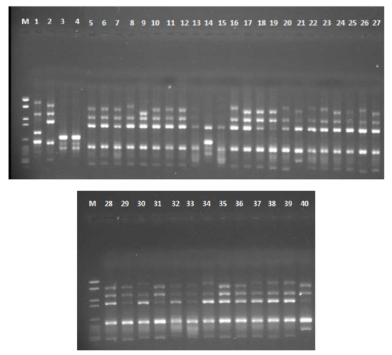 Gel electrophoresis of PCR-ISSR amplification using (GTG) 5 primer for 40 Aspergillus isolates. The upper gel contains the following lanes: M = DNA marker, 1 = AF 144, 2 = AF 1305, 3 = AF 1554, 4 = AF 2041, 5 = AF 2118, 6 = AF 2525, 7 = AF 2649, 8 = AF 2653, 9 = AP 143, 10 = AP 1311, 11 = AP 2040, 12 = 2P, 13 = 3P, 14 = 7P, 15 = 9P, 16 = 23P, 17 = 25P, 18 = 32P, 19 = 34P, 20 = 41P, 21 = 42P, 22 = 45P, 23 = 47P, 24 = 51P, 25 = 58P, 26 = 64P and 27 = 81P. The lower gel contains the following lanes: 28 = 85P, 29 = 108P, 30 = 110P, 31 = 111P, 32 = 112P, 33 = 1E, 34 = 3E, 35 = 16E, 36 = 21E, 37 = 30E, 38 = 42E, 39 = 44E and 40 = 45E.