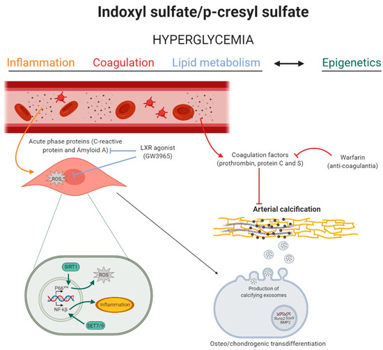 The role of inflammation, coagulation, lipid metabolism, and epigenetics in indoxyl sulfate and p-cresyl sulfate induced arterial calcification. High levels of indoxyl sulfate (IS) and p-cresyl sulfate (PCS) induce a state of hyperglycemia, which activates inflammation, coagulation, lipid, and epigenetic pathways in the vascular cell. Inflammation (yellow): acute-phase response proteins induce reactive oxygen species (ROS) production in the vascular smooth muscle cell, stimulating the phenotypic switch into osteo-/chondrogenic cells. Coagulation (red): circulating coagulation factors inhibit arterial media calcification, while the anti-coagulant warfarin stimulates the calcification process. Lipid metabolism (blue): the liver-X-receptor (LXR) agonist blocks the inflammation mediated ROS production and, by this, inhibits arterial media calcification. Epigenetics (green): IS and PCS induced hyperglycemia might trigger sirtuin 1 (SIRT1)- and Set7/9-mediated epigenetic changes in the promoter of, respectively, p66She gene and NF-kB subunit p65, favoring, respectively, mitochondrial ROS production and inflammation in the cell. Figure was created with BioRender.com.
