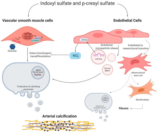 Indoxyl sulfate and p-cresyl sulfate induced molecular mechanisms in vascular smooth muscle cells and endothelial cells. Indoxyl sulfate (IS) and p-cresyl sulfate (PCS) influence the behavior of vascular smooth muscle cells (VSMCs) and endothelial cells. Right side: microRNA miR-29b and miR-223 favor the osteo/chondrogenic switch of VSMCs by promoting the expression of Wnt7b/β catenin signaling and potentially increasing the uptake of glucose via a glucose transporter (GLUT), respectively. Left side: IS and PCS stimulate endothelial microparticle release. These microparticles secrete microRNA miR-92a, calcium, and bone morphogenic protein 2 (BMP2), which in turn induce a phenotypic switch of VSMCs into osteo/chondrogenic cells directly or indirectly through influencing endothelial nitric oxide synthase (eNOS) and thus decreasing nitric oxide (NO) bioavailability. Moreover, IS and PCS could trigger the endothelial to mesenchymal transition of endothelial cells into osteo/chondrogenic cells and myofibroblast, stimulating arterial calcification and fibrosis. Figure was created with BioRender.com.
