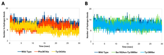 Each InlA-Ecad complex underwent molecular dynamic simulations to assess the possible effects of mutations on the geometrical stability of InlA-Ecad interaction over the time. The overall analysis of complex stability relied on the root-mean-square deviation (RMSD) analysis of protein C-alpha, while the root-mean-square fluctuation (RMSF) analysis of protein C-alpha was performed to locally measure the mobility of protein residues, in agreement with previous studies [27]. According to the results of RMSD and RMSF analysis, there were no appreciable differences among the mutated variants and the wt complex, as, in all the cases analyzed here, each complex kept stable its overall geometry regardless of the mutation hold. This evidence pointed to the overall stability of InlA and it was in agreement with other authors that were not able to show a geometrical destabilization of unfavorable InlA-Ecad complex in molecular dynamic simulations at a nanosecond scale [21]. Nonetheless, in the present study, the thorough analysis of InlA-Ecad interface contacts network revealed significant difference between destabilizing (Tyr343Ala and Phe367Ala) and stabilizing mutations (i.e., Tyr369Ser and the double mutant Ser192Asn-Tyr369Ser) that could be used to appreciably distinguish the qualitative effects of missense mutations. In more detail, the complexes holding mutations impairing the InlA-Ecad interaction recorded a reduction of the overall number of hydrogen bonds, which was more pronounced in the case of Tyr343Ala, in comparison to the wt complex (Figure 2A). Conversely, those variants that hold mutations increasing InlA-Ecad interaction scored a comparable or slightly higher number of hydrogen bonds than the wt complex (Figure 2B).