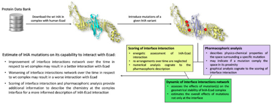 Our work showed a cost-effective and time-saving framework of analysis to investigate the potential effects of inlA missense mutations on the very early molecular event underlying the cell invasion of L. monocytogenes. In more detail, our work proved for the first time that a molecular modeling study may succeed to qualitatively calculate the effects of inlA missense mutations in relation to the capability to stabilize InlA-Ecad complex. Of note, in case of simultaneous mutations at the InlA-Ecad interface and in other positions not in its proximity, the scoring of effects of mutations at the interface has to be integrated by MD simulations to thoroughly calculate the global effects on the InlA-Ecad complex stability over the time.