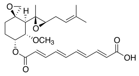 The acidic portion of the molecule is also a good chromophore responsible for the strong absorption of fumagillin in the ultraviolet range, with maxima around 335 and 350 nm (Figure 2) [44].