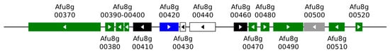 Arrangement of genes in the fumagillin cluster of A. fumigatus Af293 strain (Afu8g00370-Afu8g00520; ORF names, Source NCBI Database [65]. Green: genes implicated in biosynthetic pathway; blue: regulatory gene; gray and black: other genes related with fumagillin; white: non-related fumagillin genes.
