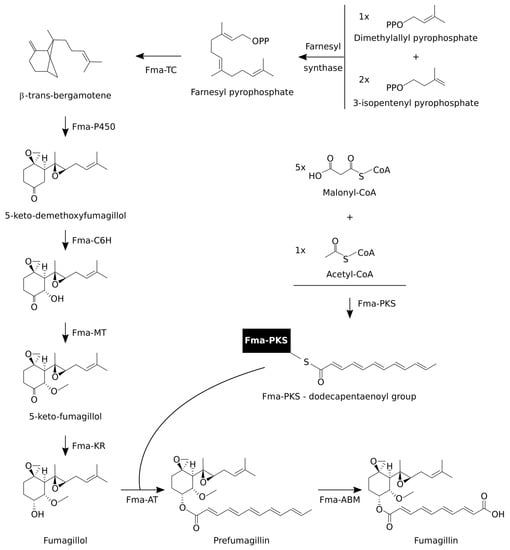 Briefly, two components are required for the generation of fumagillin, a structure composed of a rearranged highly oxygenated sesquiterpene and a polyketide-derived tetraenoic diacid. They are produced by two different biosynthetic branches [62,63], which are subsequently joined by esterification.