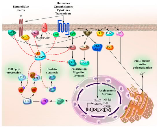 Among the molecules affected by the inhibition of MetAP, the guanine nucleotide-binding proteins (G protein-coupled receptors or GPCRs) are a ubiquitous and well-studied family of proteins that need to be N-terminally processed [122]. Namely, the myristoylation of Gi/o α subunit allows the association with membranes, indispensable for the efficiency of the protein Gi/o but not for Gs [123]. The pathway starts with an extracellular stimulus caused by the binding of hormones, cytokines, neurotransmitters, growth factors, etc., with its membrane GPCRs characterized by seven membrane-spanning regions [124]. Afterwards, these proteins activate intracellular signaling involved in numerous signal transduction pathways related to development, survival, proliferation, invasion, migration, tumorigenesis, etc. [31,122,123,124,125]. Focusing on the activation of Gi/o, its α subunit can inhibit adenylyl cyclase (AC), incrementing ATP levels and inhibiting protein kinase A (PKA) [124]. At the same time, Giα can pass the signal flow to Giβγ, which regulates phospholipase C (PLC), phosphatidylinositol 3 kinase (PI3K), Ras, and K+ channels. PLC stimulates inositol (1,4,5)-trisphosphate (IP3) which mobilizes Ca2+ and protein kinase C (PKC) via diacylglycerol (DAG) [126]. In addition, Ras activates the ERK pathway and calcium dependent proliferation. Furthermore, PI3K promotes the cell division control protein Cdc42, responsible for actin reorganization, necessary for cell adhesion, polarization, migration and invasion [127], and the protein kinase B (PKB/AKT), triggering the activation of numerous anti-apoptotic genes (NF-κB, BAD, CREB, etc.) and inhibiting p53 via the activation of FoxO and Mdm2 (Figure 6) [128]. Besides, PI3K activates the extracellular signal regulated protein kinase (ERK) cascade.