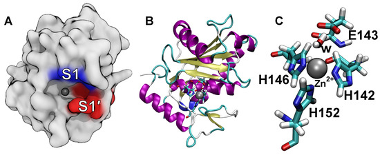 The SVMPs are zinc-dependent endopeptidases, with a molecular masses between 20 and 100 kDa. These enzymes are members of the subfamily of proteinases known as metzincins. They contain a consensus zinc binding sequence, HEXXHXXGXX, and a 1–4 turn containing a highly conserved methionine residue that underlies the three histidine residues and zinc cofactor involved in the catalysis []. SVMPs are classified as type P-I, P-II, or P-III, depending on domain organization. P-I SVMPs consist only of a proteinase domain, while P-II SVMPs possess proteinase and disintegrin domains. P-III SVMPs have proteinase, disintegrin, and cysteine rich domains []. BaP1, a P-I metalloproteinase isolated from the venom of B. asper inhabiting the Pacific region of Costa Rica, has been extensively studied since its crystallographic structure was reported []. P-I type metalloproteinases constitute about 30% of Pacific B. asper venom proteins []. The structure of the BaP1 is shown in Figure 1. When a polypeptide is hydrolyzed by the SVMP, its scissile peptide bond is positioned near the zinc cofactor of the metalloproteinase and the residues preceding and following this bond make contact, respectively, with the S1 and S1 subsites (Figure 1A) [,]. The residues of BaP1 in the active site, as well as the catalytic water molecule, are highlighted in Figure 1B,C.