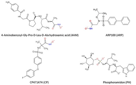 ARP-100 (ARP) is a hydroxamate peptidomimetic with a sulfonamide group and a biphenyl moiety that has been reported as a MMP-2-preferring inhibitor with an IC value of 12 nM []. 4-aminobenzoyl-Gly-Pro-D-Leu-D-Ala hydroxamic acid (4AM) is a tetrapeptidyl hydroxamic acid; it is alternatively called MMP Inhibitor I (IC = 1.0 M). It also inhibits MMP-8 (IC = 1.0 M) and MMP-9 (IC = 50 M) [,]. CP 471474 (CP) is a pyran-containing sulfonamide hydroxamate that was developed by Pfizer. It is a broad spectrum MMP inhibitor (IC values are 0.7, 0.9, 13, 16 and 1170 nM for MMP-2, MMP-13, MMP-9, MMP-3 and MMP-1, respectively) []. This compound also inhibits cigarette smoke-induced lung inflammation and the progression of emphysema in guinea pig models []. The fourth compound considered in this work, phosphoramidon (PH), lacks a hydroxamate group: it possesses instead a phosphonate, which may serve a similar role as an anionic group that can coordinate the catalytic metal ion of metalloproteinases. It was initially isolated from Streptomyces tanashiensis cultures, and it has been reported as an inhibitor of the metalloendopeptidase thermolysin [] and membrane-bound zinc metalloproteinases, neprilysin (NEP) and NEP2, with a of 2 nM for both enzymes []. The structures of the inhibitors considered in this work are shown in Figure 2.