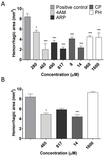 Hemorrhagic activity was quantitatively determined following the method adapted by []. Groups of four mice were injected intradermally with different concentrations of each inhibitor and the metalloproteinase (30 g) previously pre-incubated at 37 C for 30 min. The metalloproteinase alone was used as positive control and each compound alone at the highest evaluated concentration were used as negative controls. After 2 h, the animals were euthanized by CO inhalation, the skin was removed and diameters of the hemorrhagic lesions were measured. The evaluated concentrations were in the interval 25–400 M for 4AM and ARP, 0.625–20 M for CP, and 25–500 M for PH, following a series of two-fold dilutions in these ranges.