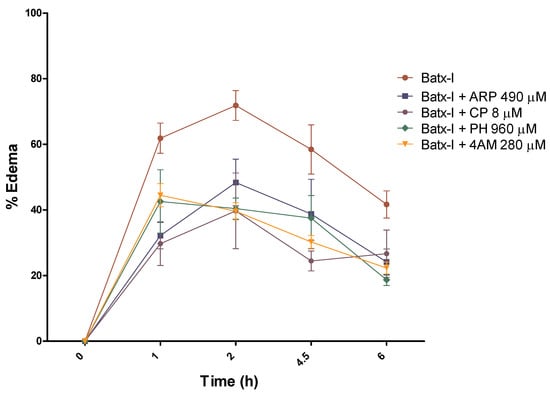 These compounds’ inhibition of Batx-I edema-forming activity is consistent with their inhibition hemorrhagic activity, as well as their previously reported anti-inflammatory activity for different pathologies [,].