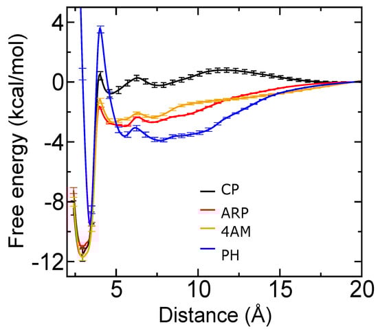 Potential of mean force as a function of distance between the hydroxamate (4AM, ARP, CP) or phosphonate group (PH) and the Zn ion obtained from adaptive biasing force calculations.
