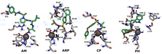 In the design of sulfonamide hydroxamates, such as CP and ARP, the sulfonamide group was incorporated to form hydrogen bonds and improve the enzyme–inhibitor binding by directing the hydrophobic substituent into the S1 pocket []. Consistent with this, we observe hydrogen bonding between the phosphonate oxygen atoms of CP and the hydroxy group Thr107, as exemplified in Figure 6, CP. Furthermore, we also find contacts between sulfonamide-attached hydrophobic groups and side chains of residues making up the S1 subsite, such as Ser168, Leu170, and Trp135. An example of these contacts is seen in Figure 6, ARP.