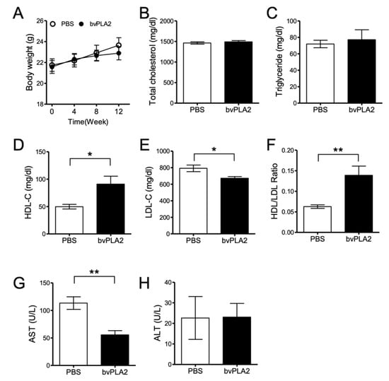 We investigated the therapeutic effect of bvPLA2 on atherosclerosis caused by a high-fat diet. Eight- to ten-week-old ApoE knock out (ApoE-/-) mice were used to induce hypercholesterolemia with an atherogenic high-cholesterol diet (D12336; Research Diets, Inc., New Brunswick, NJ, USA) for 12 weeks. The mice were divided into phosphate buffered saline (PBS) and bvPLA2 (0.2 mg/kg) groups and injected intraperitoneally (i.p.) every 2 days after a 4-week diet. Body weight was measured every week, and it increased less in the bvPLA2 group compared to that in the PBS group (Figure 1A). However, there was no significant difference between the two groups. Blood was also collected from the inferior vena cava to perform lipid analysis. Total cholesterol (TC) and triglyceride (TG) were not significantly different between those groups (Figure 1B,C). However, high-density lipoprotein cholesterol (HDL-C) was significantly increased (Figure 1D, p < 0.05, t = 2.739, df = 10) and low-density lipoprotein cholesterol (LDL-C) decreased (Figure 1E, p < 0.05, t = 2.694, df = 10) in the bvPLA2-treated group. The HDL/LDL ratio was significantly increased in the bvPLA2 group (Figure 1F, p < 0.01, t = 3.341, df = 10). Aspartate aminotransferase (AST) and alanine aminotransferase (ALT) were also measured to confirm the hepatotoxicity of bvPLA2. It was found that AST levels were significantly decreased in the bvPLA2 group (Figure 1G, p < 0.01, t = 4.214, df = 8), but there was no change in ALT (Figure 1H). To address the systemic effects of bvPLA2 on the production of bioactive lipids, the levels of prostaglandin E2 (PGE2) and arachidonic acid (AA) in vivo were analyzed. The results showed that bvPLA2 (0.2 mg/kg, i.p.) treatment did not induce the release of PGE2 or arachidonic acids in various tissues (Appendix A, Figure A1).