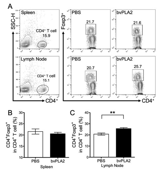 To measure the increase of Treg cells following bvPLA2 treatment in the tissues, mouse spleens and peripheral lymph nodes (brachial, axial) were analyzed. Monocytes were isolated from the spleen and lymph nodes and analyzed by flow cytometry (Figure 2A). In the spleen, there was no difference in the CD4+ Foxp3+ Treg cell populations between the PBS and bvPLA2 groups (Figure 2B). On the other hand, there was a significant increase in CD4+ Foxp3+ Treg cells in the lymph nodes of the bvPLA2 group (Figure 2C, p < 0.01, t = 3.601, df = 20). This result is in accordance with previous results that the Treg cell populations quantitatively differ between the peripheral lymph nodes and the spleen to maintain homeostasis [21].
