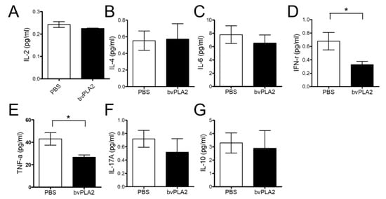 Effect of bvPLA2 on inflammatory cytokines. Inflammatory cytokines were analyzed and quantified in the serum by FACS analysis. The serum that separated from the blood was analyzed. The inflammatory cytokines, (A) IL-2, (B) IL-4, (C) IL-6, (D) IFN-γ, (E) TNF-α, (F) IL-17A, and (G) IL-10, were investigated. The data are displayed as the means ± SEM. The statistical analyses were conducted with Student’s unpaired t test; *, p < 0.05 vs. the PBS group; n = 9.