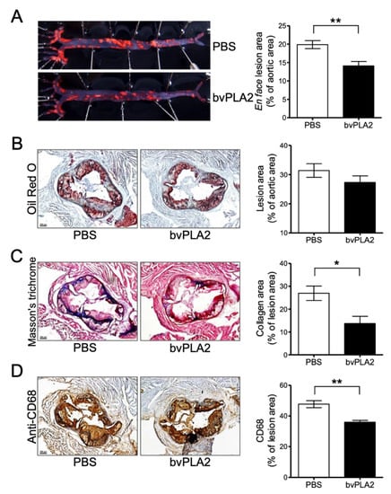 2.4. bvPLA2 Treatment Reduces Atherosclerotic Lesions and Foam Cell Formation