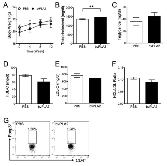 We used the ApoE-/-/Foxp3DTR mice to confirm whether bvPLA2 has therapeutic effects on Treg depletion. ApoE-/-/Foxp3DTR mice fed an atherogenic diet for 12 weeks were injected i.p. with either PBS or bvPLA2 (0.2 mg/kg) every 2 days after a 4-week diet. For Treg depletion, ApoE-/-/Foxp3DTR mice were injected i.p. with 1 µg of diphtheria toxin (DT) for two consecutive days during the atherogenic diet. There were no significant differences in body weight, TG, HDL-C, LDL-C, or HDL/LDL ratio between the PBS and bvPLA2 groups (Figure 5A,C–F). However, the total cholesterol slightly increased in the bvPLA2 group (Figure 5B, p < 0.01, t = 3.464, df = 9). Treg depletion was confirmed by flow cytometry analysis using mouse peripheral lymph node cells (Figure 5G). Thus, we confirmed that bvPLA2 exerts its functions depending on the presence of Treg.