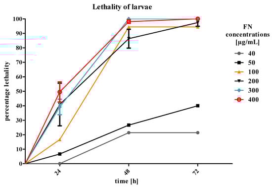 After the first 24 h of treatment, the lethality of larvae was estimated. The values for LC50/24h (lethal concentration) and LC40/24h where 400 μg/mL and 300 μg/mL, respectively (Figure 1). These concentrations caused 100% mortality of larvae after 72 h of treatment and were chosen for further experiments. The lowest used concentrations (40 and 50 μg/mL) caused reversible paralysis of insects. After the application of the concentrations of 200 μg/mL and 100 μg/mL, the mortality after 72 h of treatment did not reach 100%. As a control, 70% ethanol was used, and did not show any lethal effects on larvae.