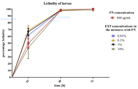 Comparing the lethality of larvae after application of FN–EXT blends to FN only, a slight, insignificant increase of lethality of larvae can be observed when the two compounds were applied. While the lethality reached 50 ± 6.9% (±SEM) after application of FN in the concentration of 400 μg/mL, the FN–EXT blends increased the mortality to 68.7 ± 6.9%, 66.6 ± 5.28% and 61.6 ± 10.2% when FN was in the mixtures with 0.1, 1 and 0.01% of the EXT, respectively. The lowest lethality of larvae after 24 h of treatment appeared after the application of the mixture of FN 400 μg/mL with the EXT at a concentration of 10% (43 ± 15.6%) (Figure 2). There was no lethality when the 70% ethanol and saline B were applied.