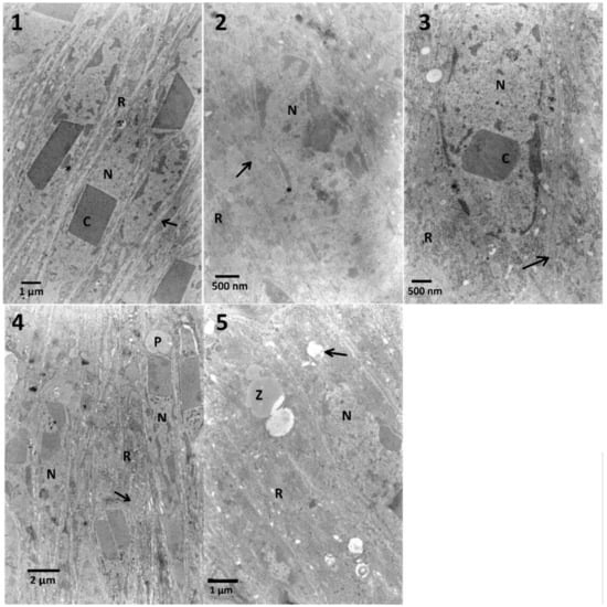 The ultrastructure of the midgut cells of T. molitor larvae after the treatment of the first variant, mixtures of FN (400 μg/mL) and EXT. No. 1—Control cells: nuclei (N) with protein crystal (C) are present. The presence of the protein crystals in the midgut nuclei is a specific feature of this species. Endoplasmic reticulum (R) surrounded by cytoplasm. Regular cell membrane and nuclear membrane are marked with an arrow and an asterisk, respectively. No. 2—Larvae fed with FN (400 μg/mL): an increase of cytoplasm density can be observed with an increase of ER (R), no irregularity in cellular and nuclear membranes can be observed (arrow and asterisk, respectively). No. 3—Larvae fed with blended FN and EXT in the concentration of 0.1%: dense cytoplasm with high amount of ER (R). An arrow points the cellular membrane. No. 4—1%: nuclei (N) with increased amount of dense chromatin, swollen ER (R, arrow) and undefined structures (P) present next to the nuclei, possibly vacuoles indicating beginning of cell degeneration, necrosis. No. 5—10%: beside swollen ER (R, arrow) in the cytoplasm other electron-dense and electron-lucent structures can be observed (Z).