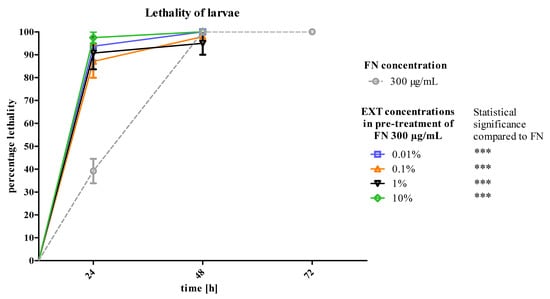 Lethality of T. molitor larvae after pre-treatment of S. nigrum EXT in four concentrations in the first day of treatment and FN in the concentration of 300 μg/mL in the second and third day of treatment compared to FN in the concentration of 300 μg/mL. Mantel–Cox test, *** p ≤ 0.01, n ≥ 30 per treatment.