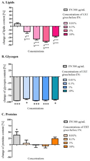 The biochemical analyses were conducted similarly as in the first variant of the experiment. Three main types of stored substances such as lipids, glycogen and soluble proteins were isolated and their concentration in the dry mass of tissue was measured. The content of lipids in the fat body after 3 days of treatment with the EXT and FN decreased significantly (Figure 7A) compared to the control (0.63 ± 0.08 mg/mg, ±SEM) but in the case of FN in the concentration of 300 μg/mL, the level of lipids scarcely, insignificantly increased (0.68 ± 0.05 mg/mg). The highest decrease was observed when the EXT in the concentration of 1% was applied before FN (0.42 ± 0.02 mg/mg). In each variant with using the EXT as a preceding factor, the average amount of lipid in the fat body was significantly lower (*** p < 0.001) from FN in the concentration of 300 μg/mL.
