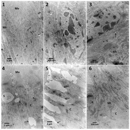 The ultrastructure of midgut cells of T. molitor larvae. No. 1—Control cells with marked microvilli (Mv), cytoplasm (C), and adherent cell membrane (arrow). No. 2—Midgut cell of larvae fed with FN (300 μg/mL). Nucleus (N) and cell membrane (arrow) are marked. Cytoplasm (C) increased its density. No. 3—Midgut cells of larvae treated with FN (300 μg/mL) with pre-treatment of 0.01% extract. Cytoplasm (C) and chromatin in the nucleus (N) are electron-dense, free space between cell membranes (arrow), and numerous mitochondria (Mt) can be observed. No. 4—Midgut cells of larvae treated with FN (300 μg/mL) with pre-treatment of 1% extract. Beside the disruption of cellular membranes (arrows) close to microvilli (Mv), the swelling of intermembrane space can be observed (S). The density of cytoplasm (C) increased. No. 5—Midgut cells of larvae treated with FN (300 μg/mL) with pre-treatment of 1% extract. In the apical part of the cells the disruption of cellular membrane is significant (arrows). No. 6—Midgut cells of larvae treated with FN (300 μg/mL) with pre-treatment of 10% extract. In higher magnification, extensive ER system (R) is present with mitochondria (Mt) in electro-dense cytoplasm (C).